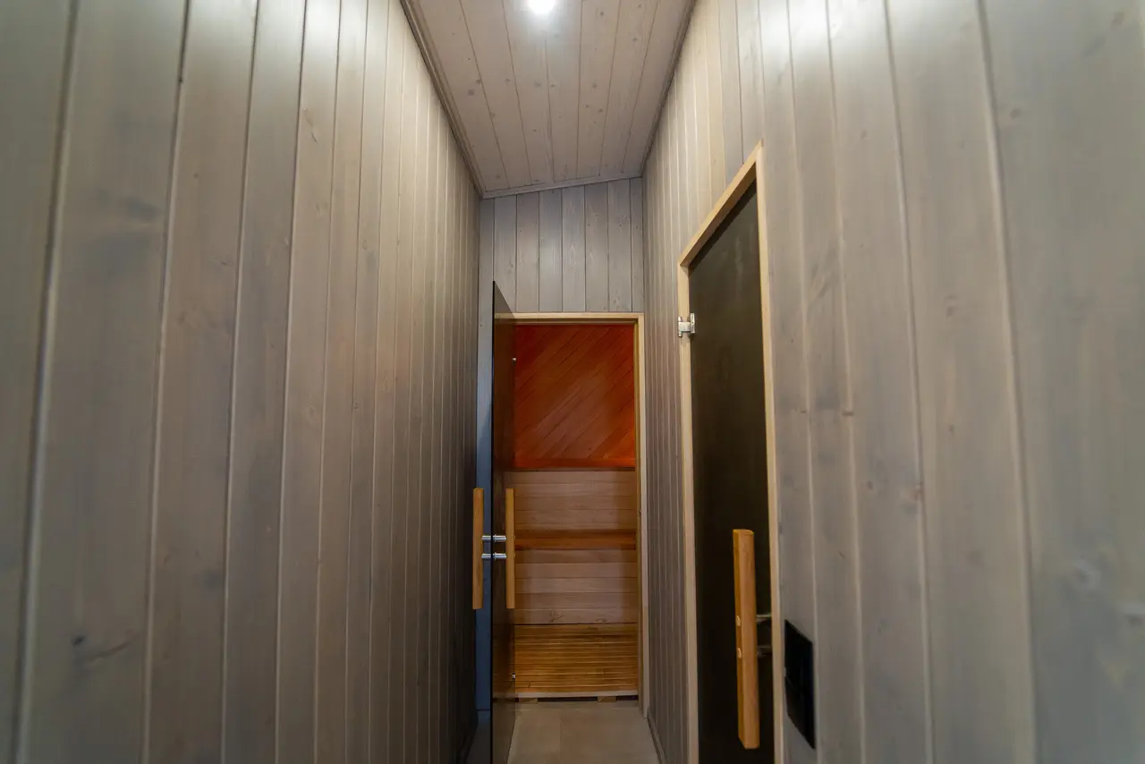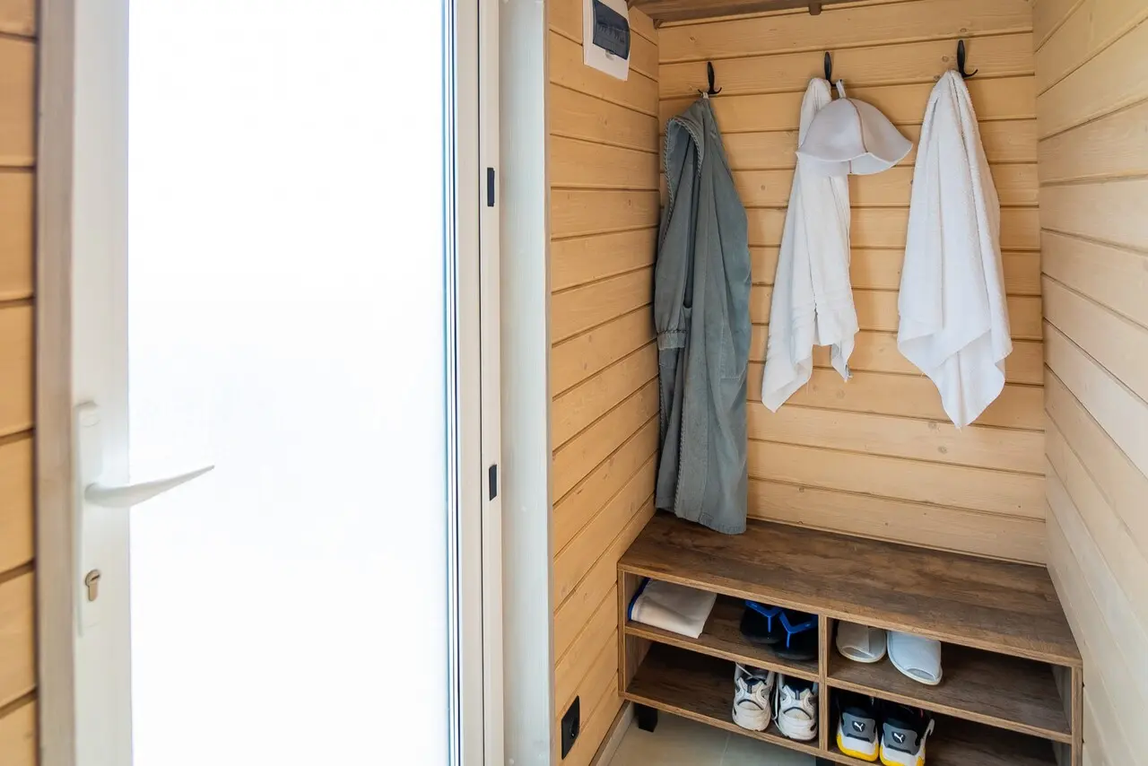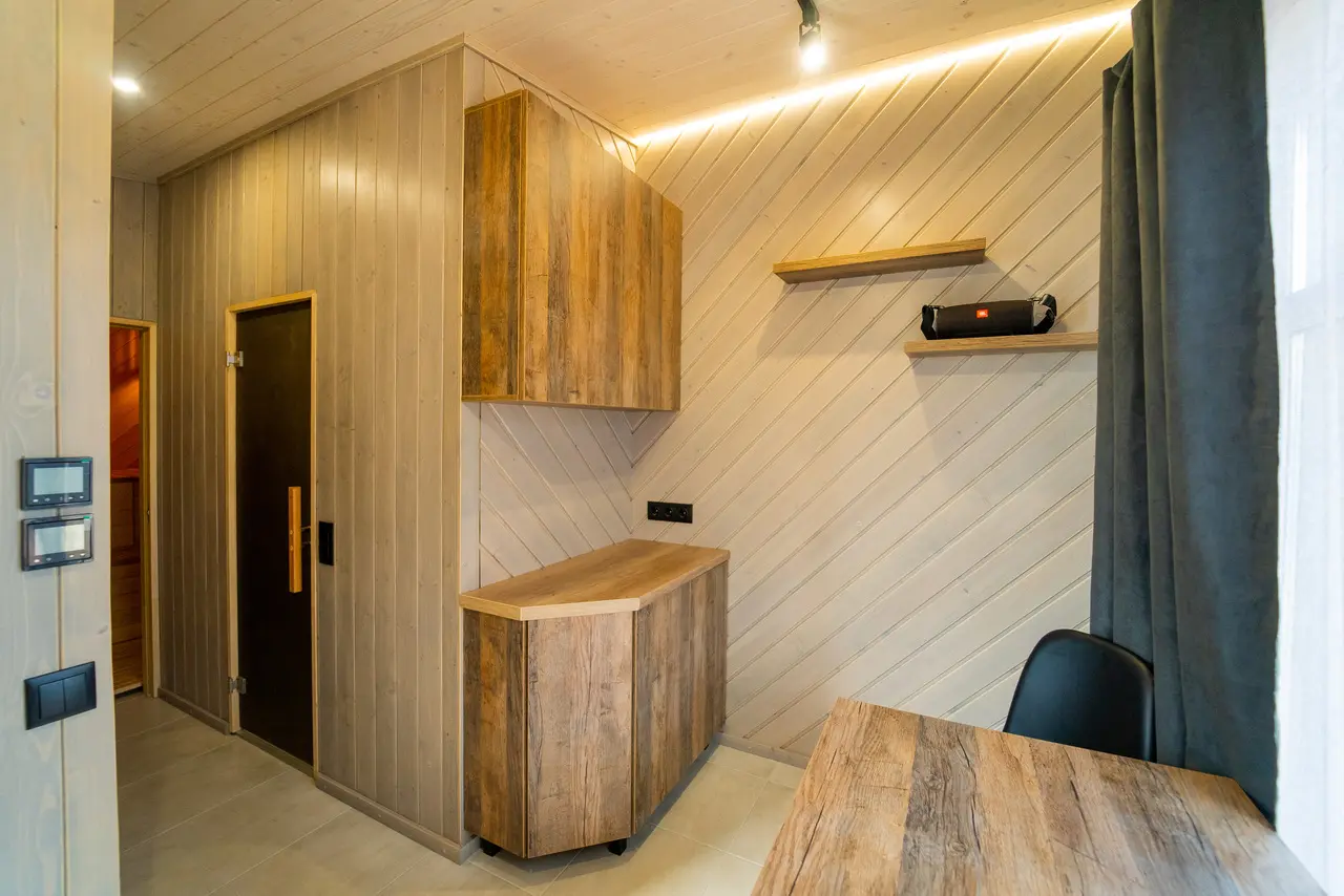 Повністю готова модульна сауна з виконаним внутрішнім оздобленням. Стіни обшиті вагонкою із термодеревини, підлога із вологостійких матеріалів, встановлена піч із камінням для рівномірного прогріву. У комплект входить освітлення та вентиляція для оптимального комфорту.